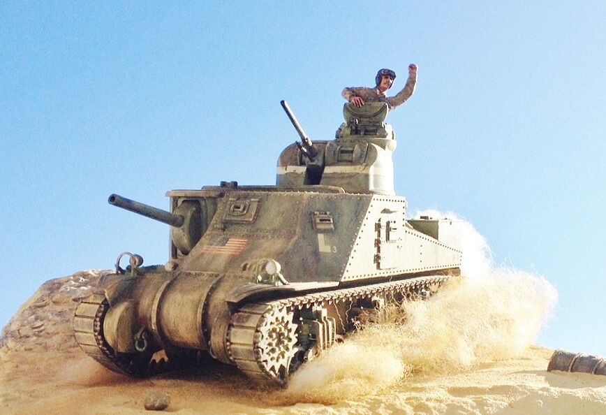 第二次大戦開始当初、アメリカ機甲部隊は貧弱で、戦車開発で大きな遅れをとっていた。そしてドイツ軍が機甲部隊によりイギリス軍を撃破しフランスを占領、ヨーロッパを制圧するとアメリカもいよいよ危機を感じ、ドイツ軍に対抗し得る戦車の開発を始め、試行錯誤と妥協によって完成したのがこのM3中戦車だった。開戦当初はアメリカは参戦はしていなかったが、武器貸与法により北アフリカ戦線で闘う英軍にM3を多数供給し、現地の英兵たちから米国式そのままの物は「リー」、英国式に改造されて運用された物は「グラント」と、南北戦争の将軍にちなんだニックネームを付けられて愛用された。主砲が車体に固定されている、車高が高くて被弾しやすい、装甲が薄いといった欠点の多い戦車だったが故障が少なく、何より対歩兵用の榴弾と対戦車用の徹甲弾の両方を撃てたため(英国の戦車は榴弾が撃てなかった)、バランスのとれた巡航戦車としてドイツアフリカ軍団相手によく闘った。そして正式に米国が参戦すると供給量もますます増加、後継車であるM4シャーマン中戦車が登場してからも北アフリカ戦線で独軍が降伏するまで活躍し続け、更に太平洋戦線では日本軍を相手に善戦、ソ連軍にも供給されて「7人兄弟の棺桶」という嫌な渾名を付けられつつも極寒の地で粘り強く闘ったのである。また、最終的に約6000輌が生産されたこのM3自体の改良型が多く作られたのはもちろんとして、その後も終戦まで活躍したM7プリースト自走砲やセクストン自走砲、と言った派生型車両の母体にもなっていまる。そういった意味ではまさに連合軍戦車の基礎と言えるだろう。